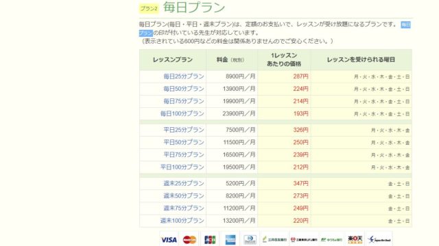 ちなみに、私は毎日プランの25分×2コマのコースで申し込みしました。毎日50分授業を受けれて月に13,900円です。レッスン一コマ辺りの値段は約224円です。