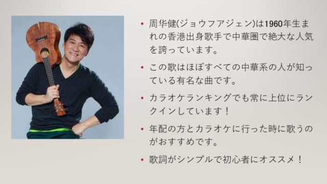 とりあえず今回が一回目なので、中国で一番有名?というくらいに皆が知っている曲をチョイスしました。周華健という歌手の【朋友】と言う曲です。こちらの曲は中華系の人であればほぼ全員が知っている曲と言われております。