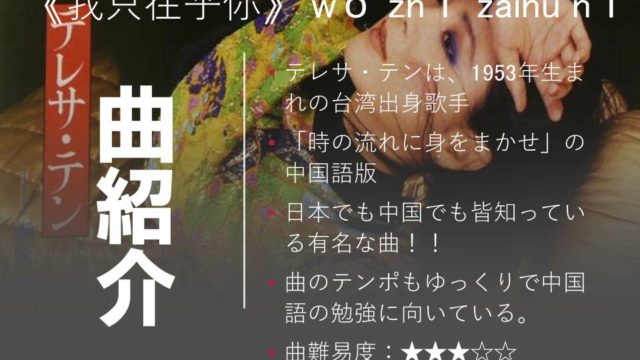 歌手は邓丽君(dèng lì jūn)、英語でTeresa Teng(テレサ・テン)と言います。テレサ・テンは、1953年生まれの台湾出身歌手で、我只在乎你(wǒ zhǐ zàihū nǐ)と言う曲は、「時の流れに身をまかせ」の中国語版で<あなただけを気にしている>と言う意味になります。