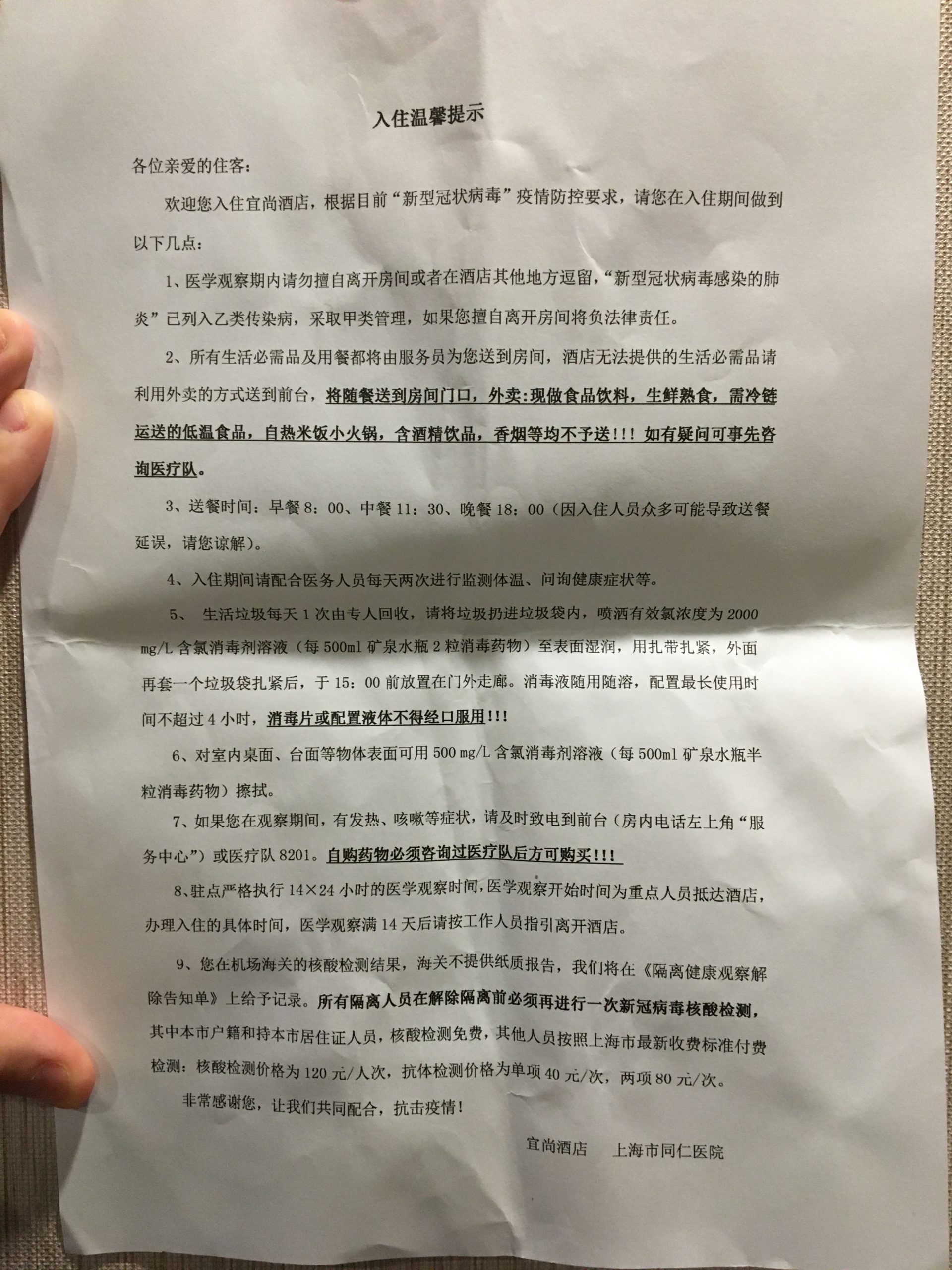 1.隔離期間内勝手に部屋から出ったり、ホテルの他の場所へ行ったりしちゃいけません。 無断で部屋から離れると法律責任を負います。 2.すべでの生活必需品及び食事についてスタッフが部屋前に送ります。 ホテルは提供できない生活必需品についてご自分で外売を頼んで、 カンターまで届きます。外売品は食事を送る時一緒に部屋の玄関外まで送ります。 外売:作り立ての食料品、飲み物、果物、総菜。 クール便で送る低温食品、小鍋、アルコール、たばこ等送ることできません。 3.食事を配る時間:朝食8:00 昼食11:30 夕食18:00 (人数が多い為、遅くなることもあります) 4.隔離期間内毎日二回の体温検査、健康状況の問診を協力してください。 5.毎日1回生活ごみを回収します。ゴミをゴミ袋に入れ、 消毒剤(濃度2000mg/L)(500ml水に2粒消毒薬品)をゴミ表面に濡れるまで スプレーし、袋をしっかりと締めて、外もう一つゴミ袋を掛けて、 締めた後15時前に部屋の外へ出してください。 消毒剤は使用するたびに作ってください。 作った後4時間内使い切ってください。消毒剤及び消毒薬品を絶対食べちゃいけません。 6.室内のテーブルなどの家具表面に500㎎/L消毒剤 (500ml水に半粒消毒薬品)で拭いてください。 7.もし隔離期間内熱や咳が出た場合すぐカンター (電話左上の“服务中心”)或いは医療室8201に電話してください。 薬物を外売を頼む前に必ず医療室に確認したうえで頼んでください。 8.隔離開始時間はチェックインした時間です。 14日満了後スタッフの案内でチェックアウトできます。 9.空港のPCR検査の結果は紙質の検査報告書がありません。 「隔離健康観察解除通知書」に記録します。 全員は隔離解除の前にもう一度PCR検査を受けなければなりません。 上海市戸籍及び上海市居住証を持つ方が無料ですが、 その他の方は下記料金で準します。 核酸検査120元/人、抗体検査一項目40元/回、二項目80元/回。