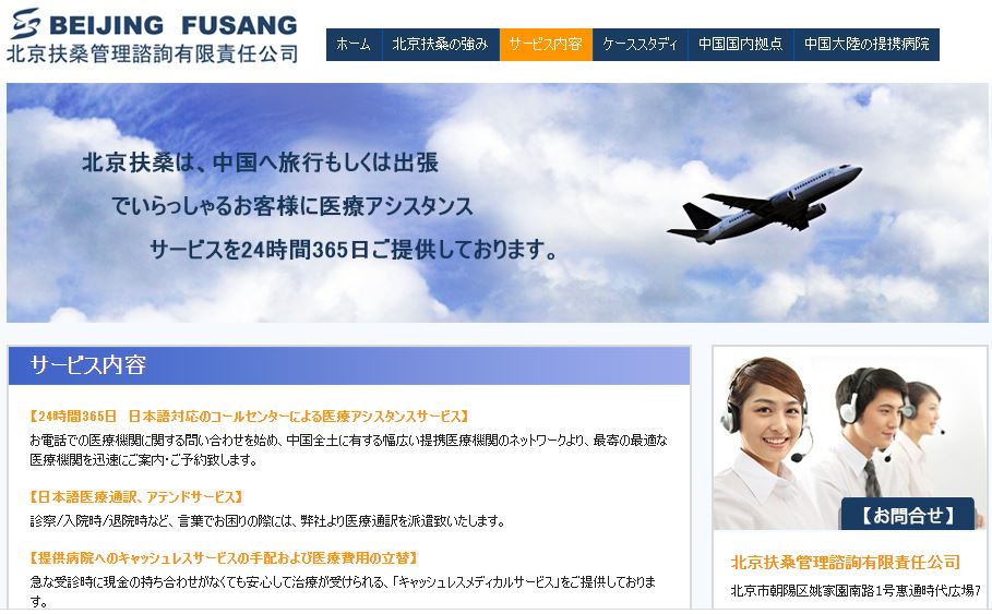 弊社では、お客様が旅行、出張、および駐在等で中国に滞在中、病気や怪我など万が一の事態に備え、24時間365日、日本語によるコールセンターを設置しております。また、日本語による医療通訳が必要なお客様には、中国の主要都市に駐在する弊社の日本語堪能なスタッフによる医療通訳サービスをご提供しております。